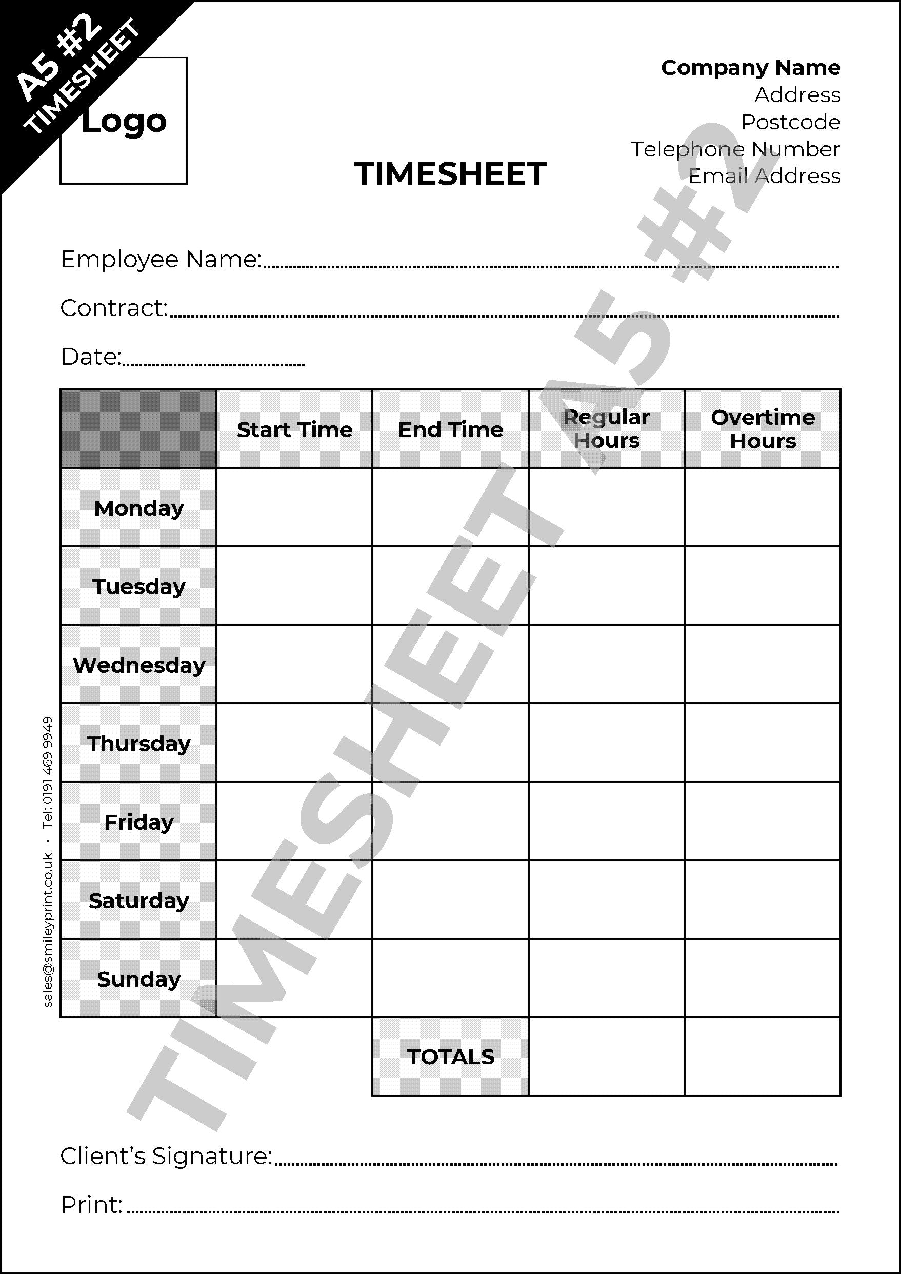 Choose from our selection of timesheet templates, available to download online, at affordable prices. We will print your order and send them to your location with a quick turnaround. Our timesheet templates include your company logo and contact details, as well as columns for start and end times, overtime, and total hours worked by staff.